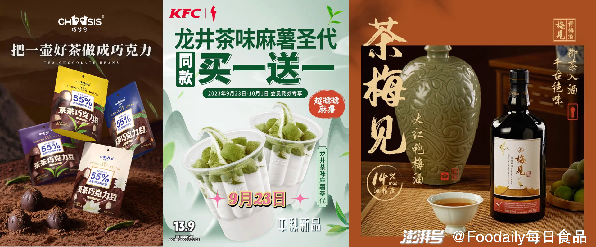 「巧兮兮」推出「茶茶巧克力豆」,共有莓果红茶味,白茶茉莉味,鸭屎香味,金桂普洱味四种口味;「肯德基」推出「龙井茶味麻薯圣代」,选用的是中国特产龙井茶;大象映画 x 梅见推出「大红袍青梅酒」,选用武夷山大红袍,御茶入酒,207天原果陶坛浸泡,茶、梅、酒融合熟化。