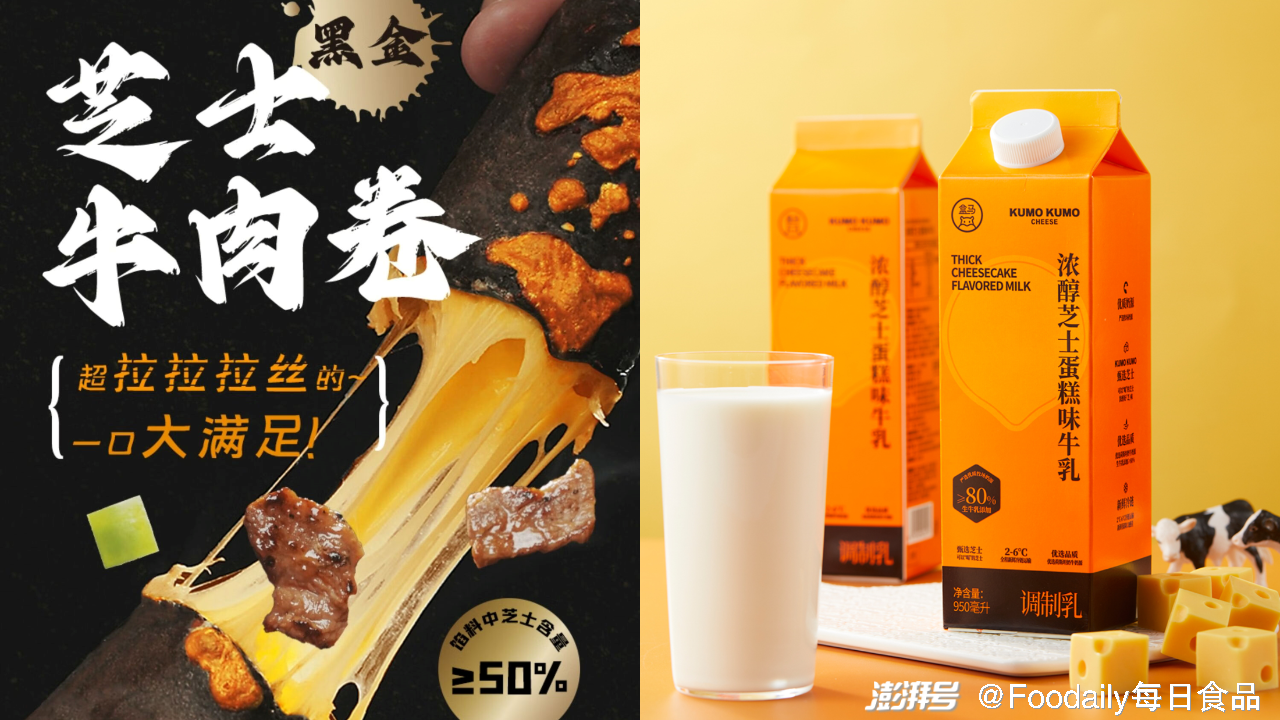 「妙可蓝多」推出有奶酪味的「芝士牛肉卷」, 馅料中芝士含量高达50%,甄选妙可蓝多马苏里拉芝士碎,让馅料富有拉丝质感。「盒马 x KUMO KUMO」联名推出了一款可以喝的芝士蛋糕「浓醇芝士蛋糕味牛乳」,以生牛乳,芝士浆和芝士粉为主材料,突出了浓郁的芝士风味。