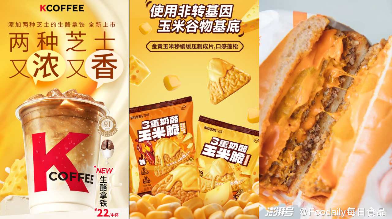 「KFC肯德基」推出「生酪拿铁」,采用新西兰奶油干酪和车达奶酪,双倍芝士,又浓又香。「伊利新食机」的「3重奶酪玉米脆」,奶酪添加量高达11%;一次满足3种口感,前调是车达奶酪带来的绵绵奶香,中调是奶油奶酪带来的淡淡甜香,后调是马斯卡彭风味奶酪带来的醇醇乳香。此外,「麦当劳」也推出了「奶丝辣双层吉士堡」,橙红色的芝士片融合了车达奶酪和辣椒成分,奶香中带着微辣。