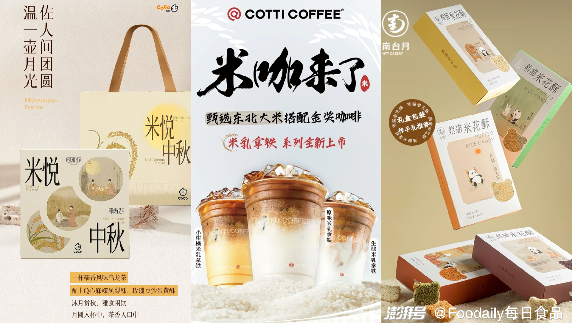 「CoCo都可」推出「米悦中秋礼盒」,其产品选用产自世界公认的“寒地水稻黄金种植带”的有机胚芽米,大小均匀,坚实丰满,清香宜人;「库迪咖啡」用五常大米搭配金奖咖啡做成的米乳拿铁,有原味米乳拿铁、小柑橘米乳拿铁、生椰米乳拿铁三款产品;「南台月」推出「熊猫米花酥」,选用西北小米、东北黑米,手剥珍珠粒花生,手工炒糖,新鲜现炒,坚果3小时低温慢烤,每颗酥都有料。