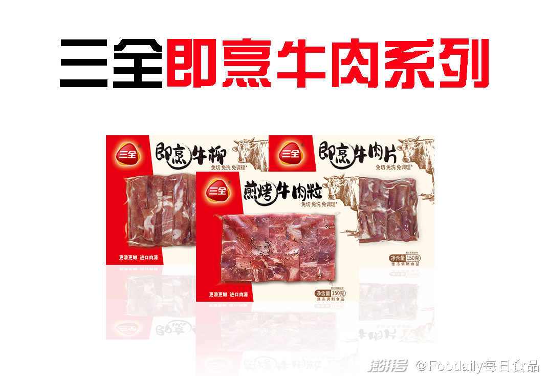 「三全」针对家庭烹饪场景,推出「即烹牛肉」系列,系列新品共有即烹牛肉片、即烹牛柳和煎烤牛肉粒三款,均免切免洗免调理,开袋即烹,可用于炒、煎、烤、炖、涮,帮助消费者更快速、便捷地完成菜肴的烹饪。在肉源上,该新品甄选世界级牛肉供应商企业优质肉源,卫生标准高,肉质更美味。