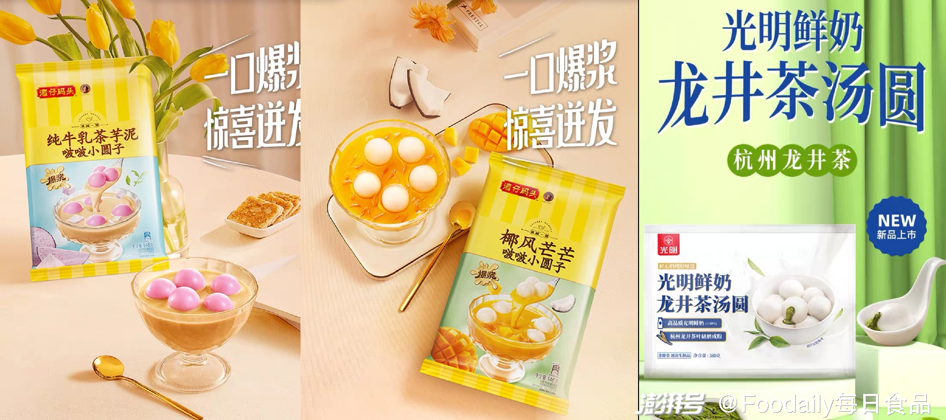 本月,「湾仔码头」上新的两款新品,更是将汤圆的甜品属性拉满:「纯牛乳茶芋泥啵啵小圆子」和「椰风芒芒啵啵小圆子」,多种口感层次,一口爆浆。同时搭配了汤料包,制作方法“一煮一拌”,主打汤圆甜品diy的理念。近日,「光明」推出「鲜奶龙井茶汤圆」,以杭州龙井茶叶为原料,研磨成粉作为馅料,鲜奶外皮包裹,打造茶香味汤圆。
