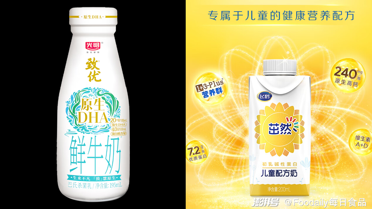 「光明致优」推出「原生DHA鲜牛奶」,原生DHA含量20mg/195ml,有益于大脑和视网膜功能的发育。「飞鹤」推出「茁然儿童配方奶液态奶」,1+3Plus营养群,加码儿童自护力:CBP初乳碱性蛋白强壮骨骼,酵母β-葡聚糖保护肠道健康,α-乳白蛋白促进神经发育,OPN骨桥蛋白促进肠道发育。