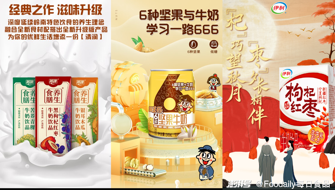此外,「旺旺」在上个月推出了「旺仔6种坚果牛奶」,含有核桃,巴坦木,腰果,碧根果,夏威夷果,开心果6种坚果,补充脑力。「伊利」也推出了「枸杞红枣牛奶」,采用了宁夏枸杞,新疆红枣,补充元气。