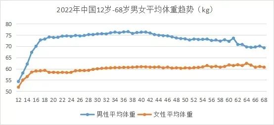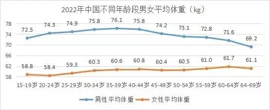 根据香山健康关于2022年平均身高体重的统计,2022年18-80岁男性平均体重75kg,女性平均体重59.8kg。