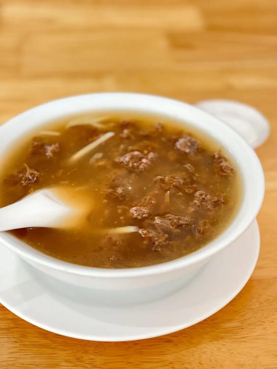 没一会儿,阿姨端着素羹汤走了过来。这是泉州特色小吃牛肉羹的素食版本,姜丝之外用了酸笋调味,吃起来开胃解腻,“牛肉”用的是炸过的大豆蛋白,配上地瓜粉勾芡的羹汤,颇有分神形相似;素海蛎煎更是绝妙,紫菜和地瓜粉做衣,散落星点素火腿、花生、笋丁和芹菜丁,煎得焦香酥脆,配上番茄酱直接以假乱真——