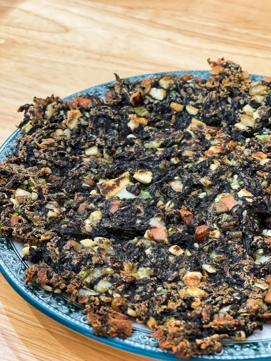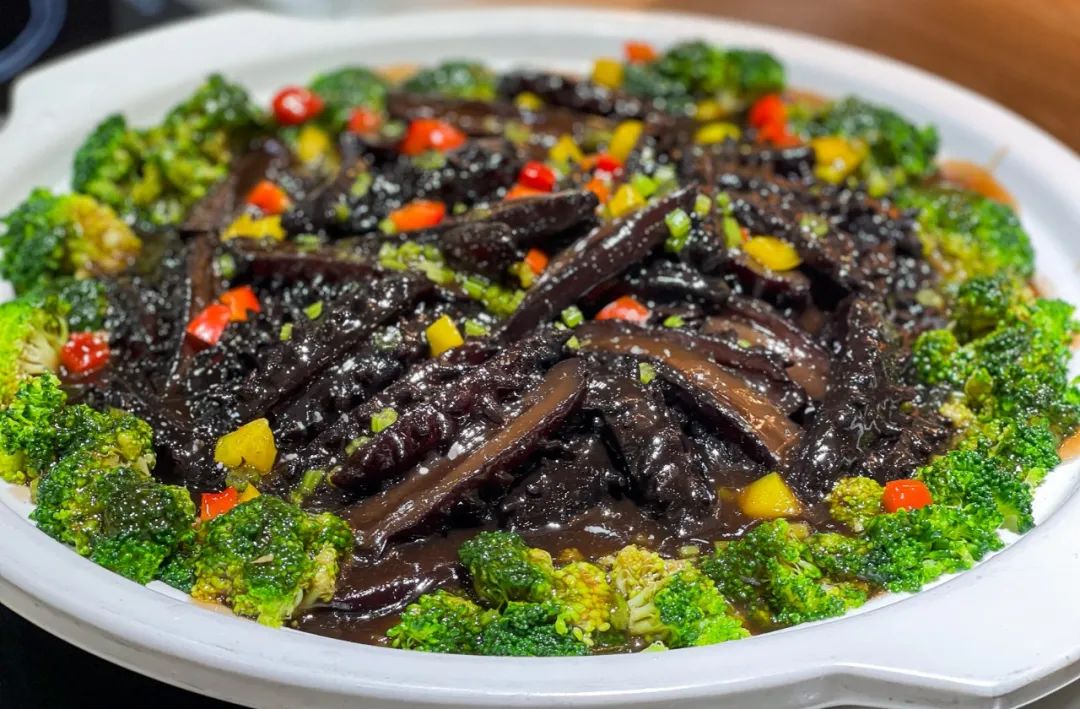 素海参裹挟的酱汁温柔厚重;荷兰豆都去了筋(怎样的工作量!),清甜脆爽;素毛血旺里的油面筋,不仅吸满了川辣的汤汁,还多了一份姜的温暖;海藻以各种前所未见的形态跟我见面,我似乎吃到了海带的梗,海发菜的须,还有紫菜炸的酥饼。在这里,我吃到了人生第一个烤黄瓜串,榴莲披萨也会以迅雷不及掩耳的速度出现了又走;我忘了我最后抢到的那个红色的是什么,只记得回味之间带着糟香…