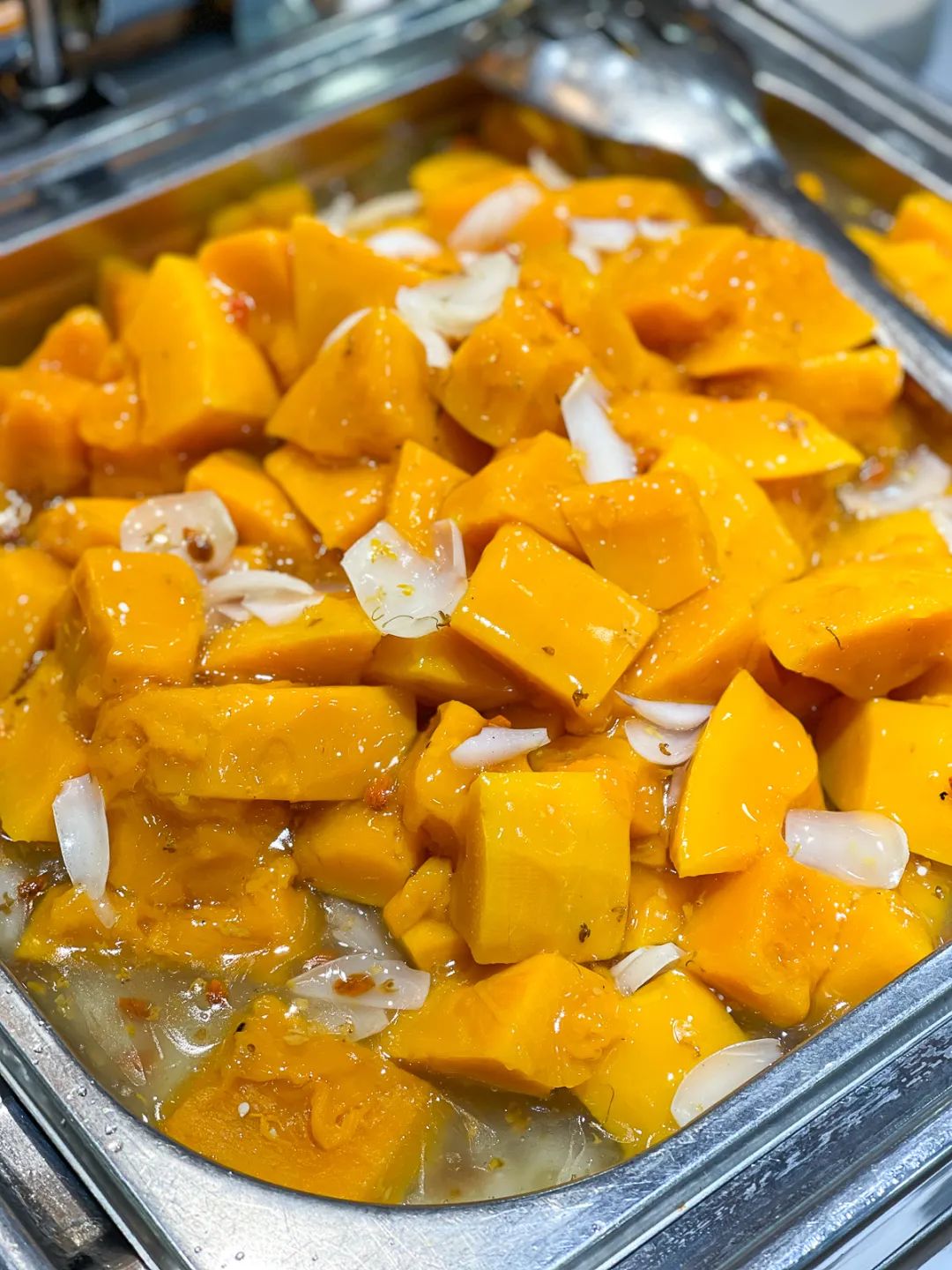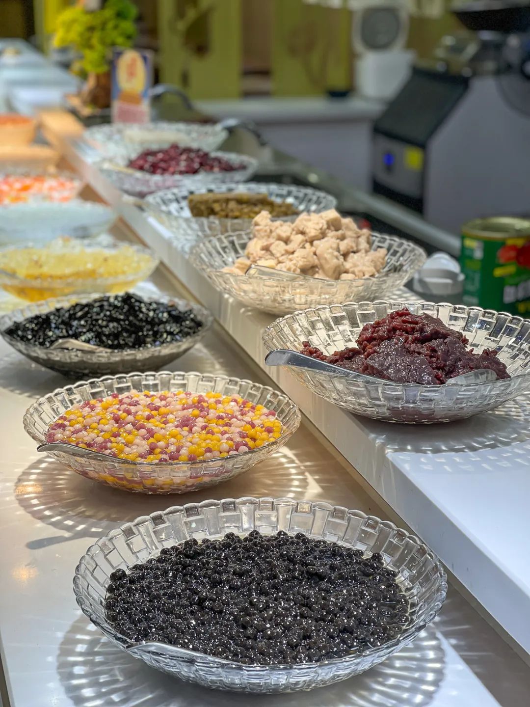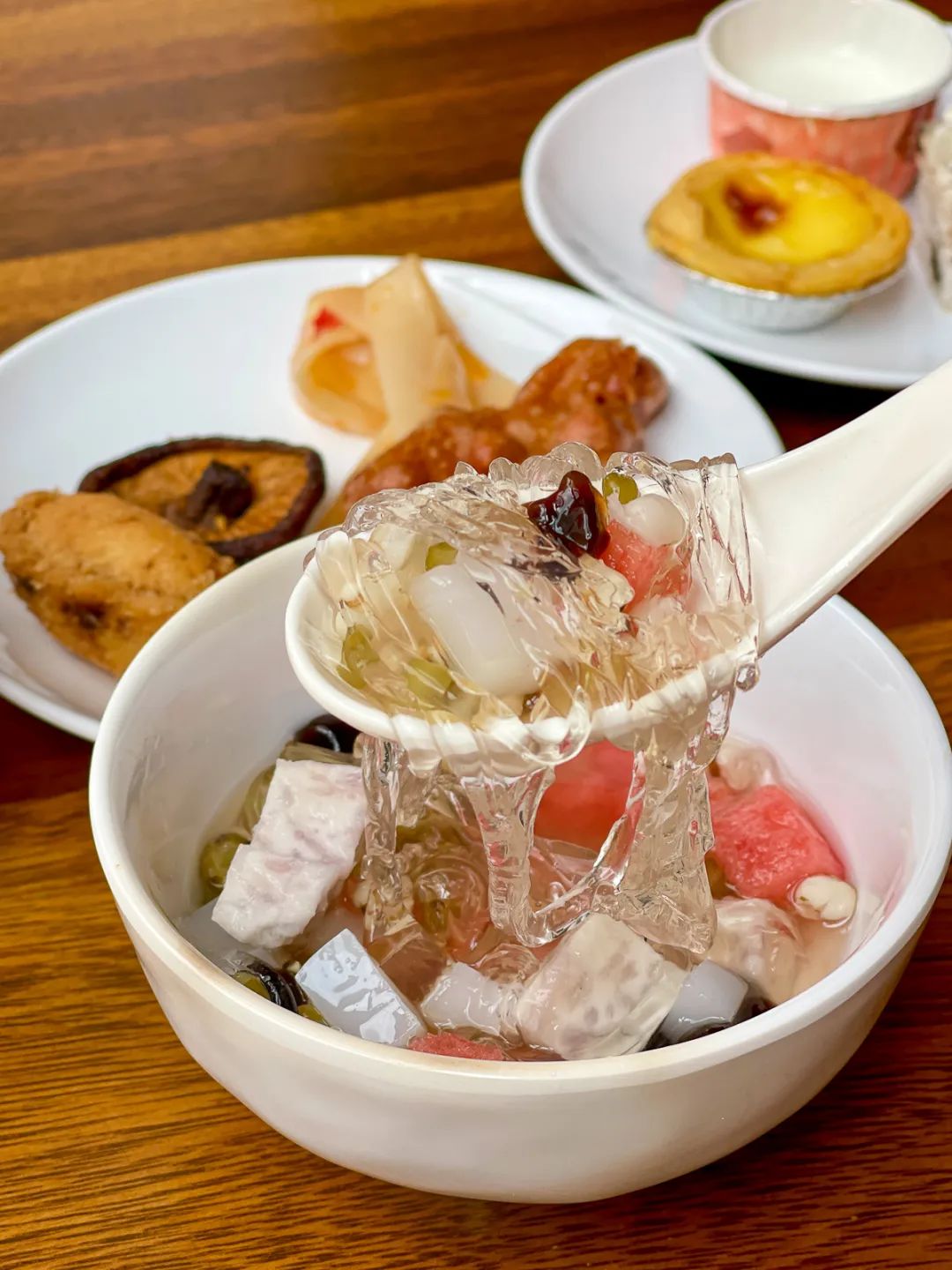 的确是想象之外的神奇世界。超过百平方米的场地,除了传统自助热菜热汤区域,还标注了“甜点”“水果”“麻辣烫”“烧烤类”“四果汤”等特色档口,每个种类都丰富到让人震惊:四果汤可搭配小料超过18种,甜品包括瑞士卷、黑森林、海苔卷、草莓慕斯、杯子蛋糕和菠萝包;随着热菜凉菜的不断更新,我看到了红烩素海参、南瓜金桂甜百合、素版毛血旺、冬瓜炖虫草菇等接近六十道热菜和二十多道凉菜,汤羹有红菇汤、四物汤、面线糊、花生汤,充满了闽南饮食特色——