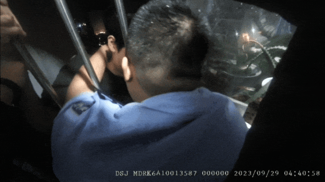 终于,护栏被凿断,孟金龙德与一起前来增援的警力合力将该男子救下。