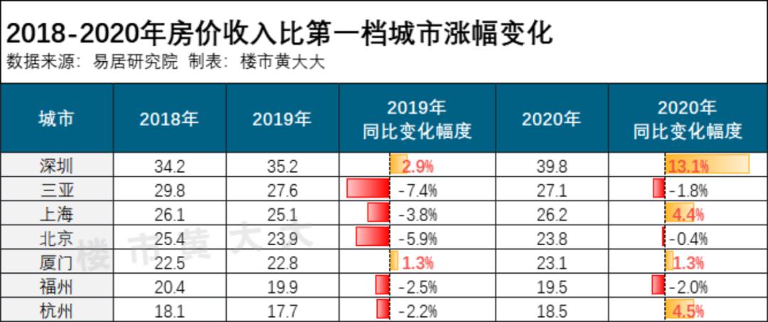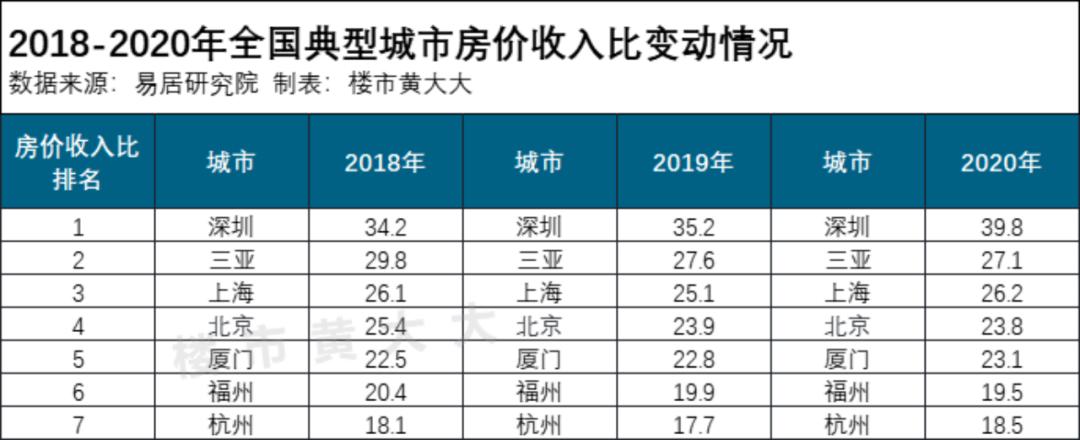 2018-2020年,房价收入比排名最前的7座城市,雷打不动。其中就包括了三亚、厦门、福州、杭州。