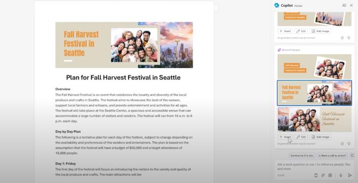 以我们最常用的 Word 为例,在写文稿的时候,你可以直接告诉 Word 一个主题,让它自动生成一段和这个主题相关的文稿。同时,它还具备配图功能,你甚至不需要花时间在网上找图,直接让它根据文字生成图片即可。