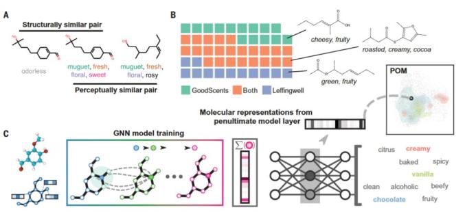 今年 8 月发表在《科学》上的一篇论文指出,科学家通过“图形神经网络”的 AI 技术,识别出了气味与成分之间的关联,生成了气味图谱。依据这个图谱,我们就可以利用已知的化合物去配置想要的味道。
