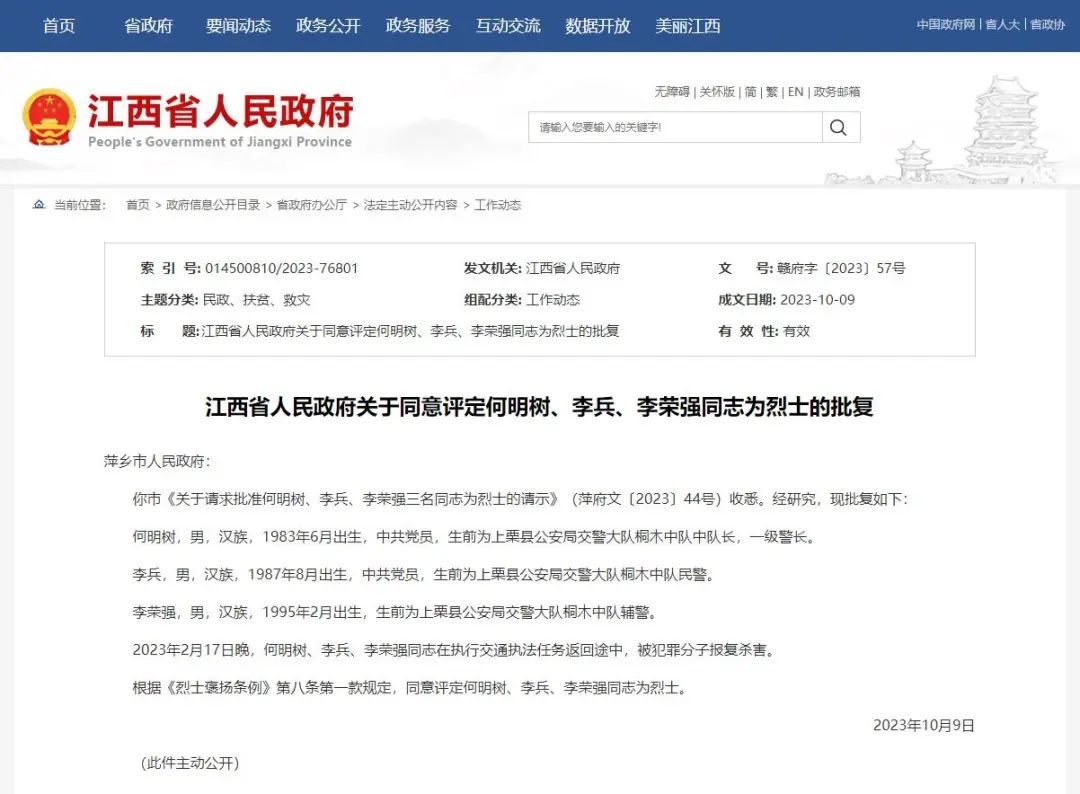 你市《关于请求批准何明树、李兵、李荣强三名同志为烈士的请示》(萍府文〔2023〕44号)收悉。经研究,现批复如下: