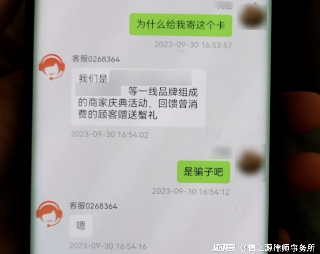 信中称,为回馈用户随机赠送大闸蟹兑换卡,可以通过扫码提货。周女士扫码后,出现一个客服聊天窗口,向周女士索要电话和卡片照片后,又发来一个新的二维码,让她再次扫码进群,并要求在进群后保持安静。