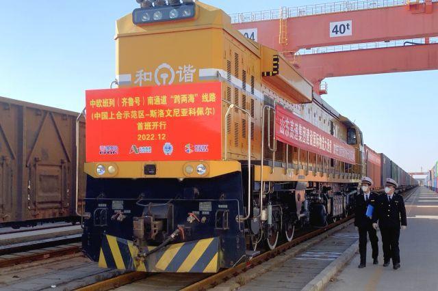 山东高度重视中欧班列打通内外循环的重要作用。中欧班列被国家定位为深化国际经贸合作的重要载体和推进“一带一路”建设的重要抓手,自2011年开行至今,连续保持了年均50%以上的增幅。在亚欧货运市场的大量需求和全球航运受阻的背景下,中欧班列安全、稳定、高效的运输优势进一步凸显,成为当前国际物流陆路运输的“黄金通道”。2016年济南、青岛、临沂3市纳入了《中欧班列建设发展规划(2016-2020)》,纳入城市数量全国最多。2022年,“齐鲁号”年度累计开行2025列,中欧班列(齐鲁号)运送的货物有来自日、韩、东南亚等国家和地区的电子、汽车零部件、橡胶、棕榈油等:过境货物由青岛港上岸后,与中国国内生产的日用百货、玻璃、轮胎、机械等产品一起,搭乘黄岛至胶州的“胶黄小运转班列”,到达位于胶州的上合示范区多式联运中心,在这里办理一站式的海关、边检手续,随后通过中欧班列(齐鲁号)向西经阿拉山口、霍尔果斯等口岸出境,到达中亚、欧洲等地。