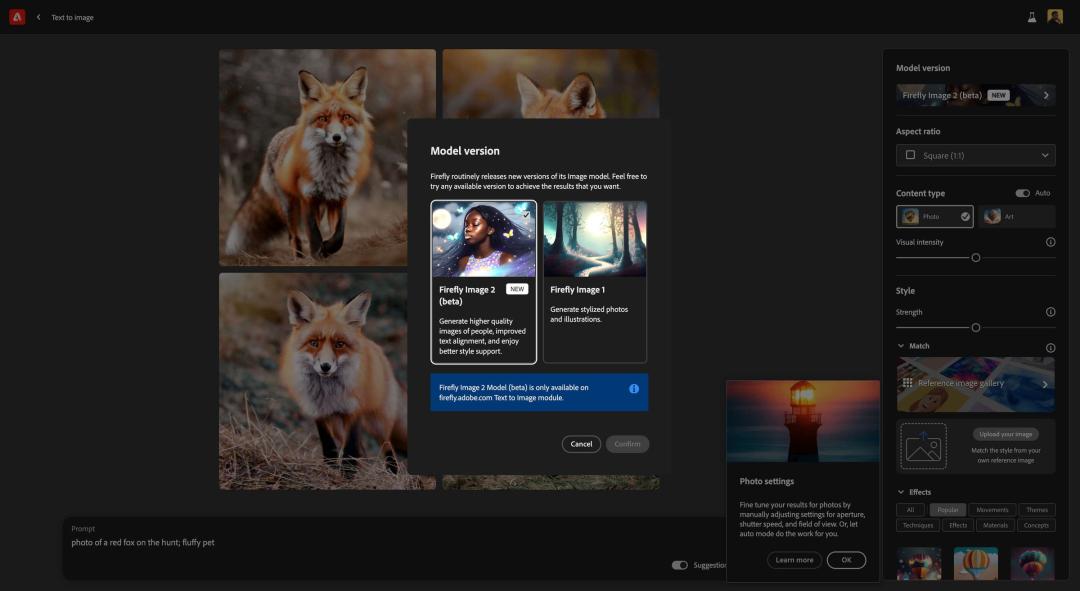 Firefly 2(包括生成匹配)预计稍后将集成到 Creative Cloud 应用程序中。同时,Firefly Vector Model 可通过 Creative Cloud 应用程序中的 Adobe Illustrator 更新获得,Firefly Design Model 目前是 Adobe Express 的测试功能。
