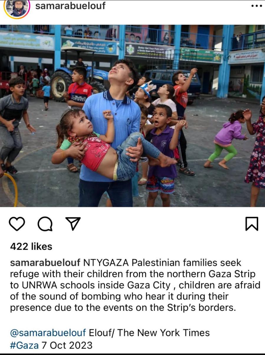 如下图所示,在巴以新一轮冲突爆发后,柯蒂斯曾一度在自己的社交账号上发布了一张图片,内容是多名儿童惊恐地看向天空。柯蒂斯还在帖文称中表示这些儿童是以色列人,并称这张照片是美国《纽约时报》的自由摄影师萨马尔·阿布·埃洛夫(Samar Abu Elouf)拍摄的。