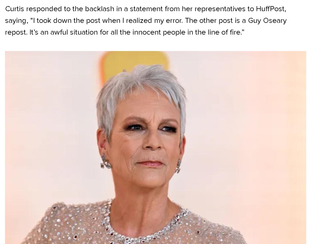 近日,在巴以新一轮冲突爆发后,曾因在华人女演员杨紫琼主演的影片《瞬息全宇宙》中的表演获得美国2023年奥斯卡金像奖最佳女配角奖的美国知名女演员杰米·李·柯蒂斯(Jamie Lee Curtis),因为一则声援以色列的帖文,令自己陷入了争议与尴尬之中,甚至被骂到删帖。