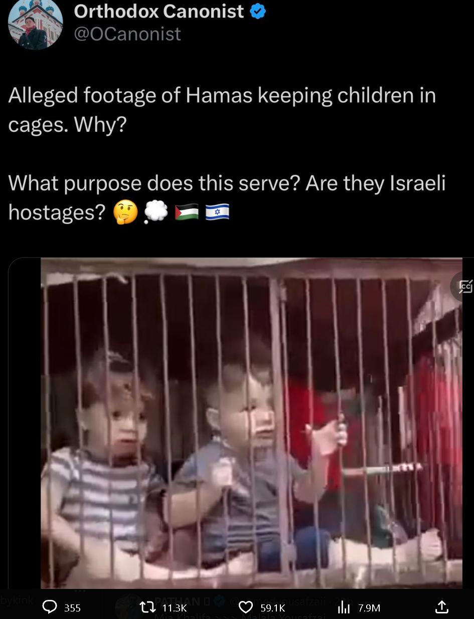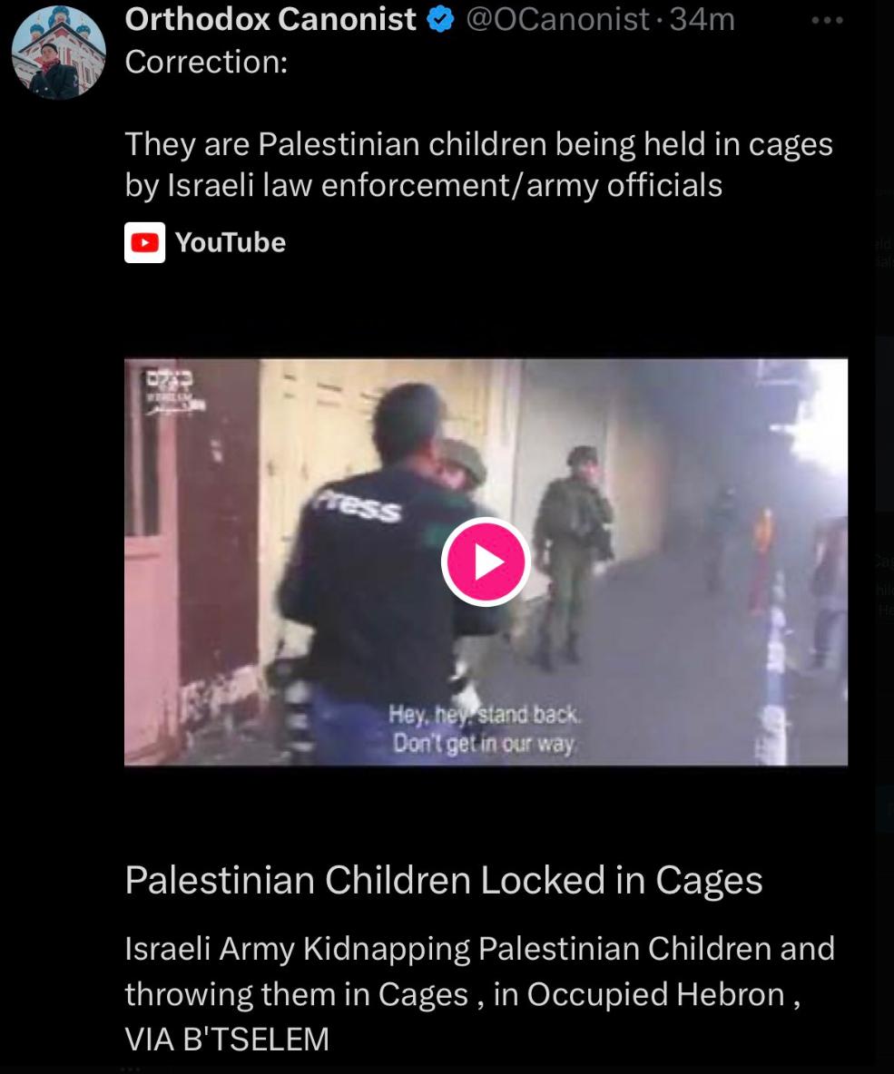 比如,下图中这个境外账号,就误将巴勒斯坦儿童被以色列军人抓走并关入铁笼的画面,误当成了是哈马斯抓走了以色列儿童。直到被许多人指出他搞错了情况后,他才发帖进行了更正。