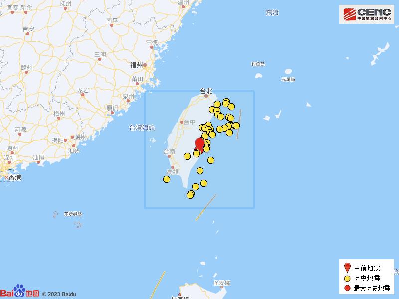 历史地震:根据中国地震台网速报目录,震中周边200公里内近5年来发生4级以上地震共268次,最大地震是2022年9月18日在台湾花莲县发生的6.9级地震(距离本次震中10公里),按震级大小前50次历史地震分布如图。