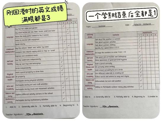 学校每周会发一次本周学习报告,1-5分表示掌握的熟练程度:1是熟练掌握,3是部分掌握,5是掌握不了。刚回香港时,孩子的英文成绩单满眼飘着3分。然而在菲佣的咖喱味英语、动画片的强制输入和爸爸的日常渗透下,到一个学期结束后,英文成绩全部都是1了。