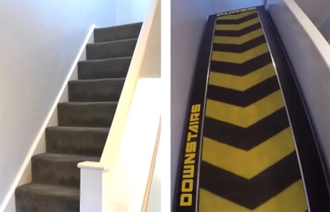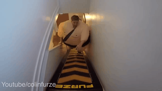 他自律过人,用传送带将自家楼梯改造成了高难度跑步机,随时随地都可以健身。(话说这小哥对自己是真的狠)