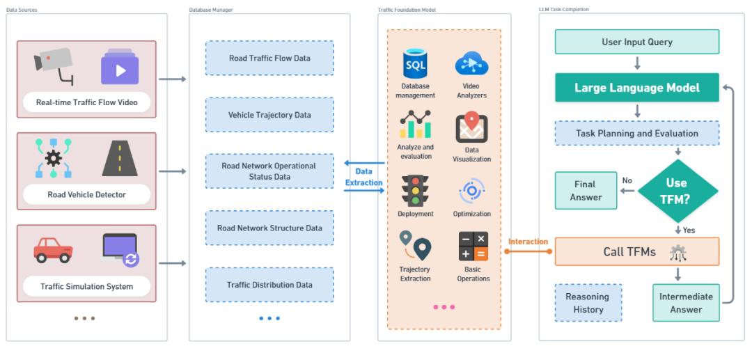 它的目标是通过强大的自然语言理解和复杂的交通系统开展交互,通过一系列可拓展的工具赋能LLM,使其真正具备多模态、大规模交通数据的处理分析能力,交通仿真、交通优化、交通评估能力,从而完成一些复杂的操作,为人类用户提供有洞见的建议和决策。