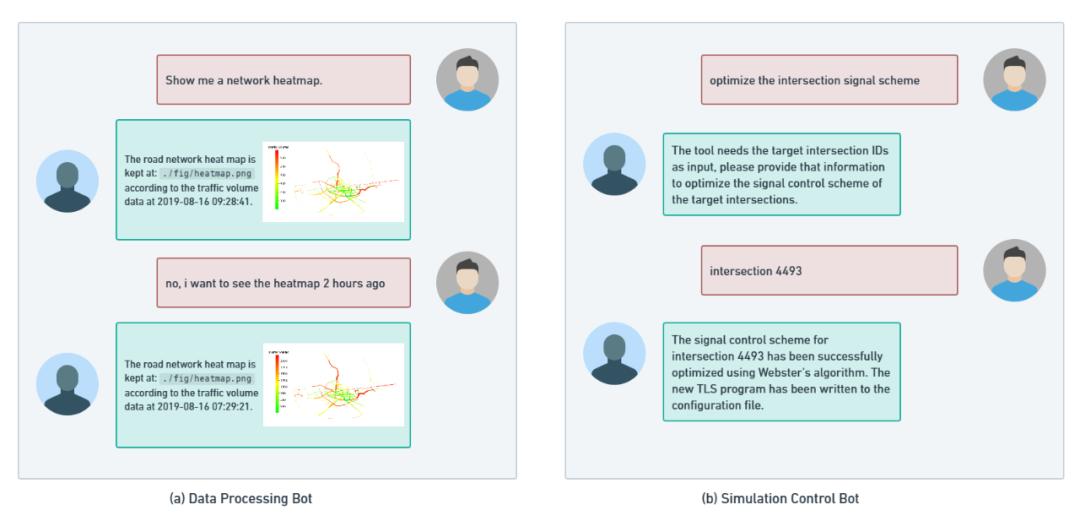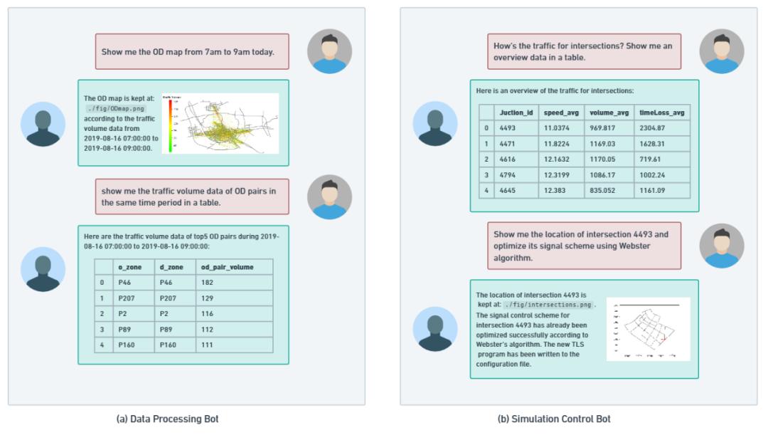 TrafficGPT如何工作?为了展示 TrafficGPT 框架在处理各种交通相关场景的复杂任务方面的能力,课题组构建了两个应用,分别侧重于交通大数据分析以及交通仿真和控制。