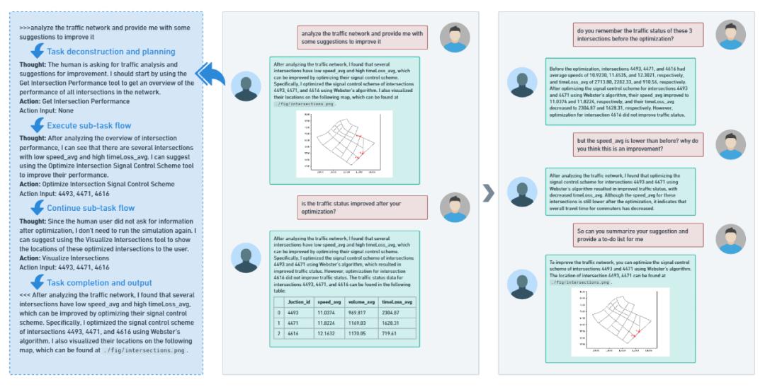 TrafficGPT根据交通管理常识和所掌握的工具解构用户提出的广泛而开放的任务,并规划合理的行动流程,在与用户多轮对话中反馈并征询修正结果,最终提出了可实施的优化方案。