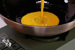 ❹ 第二次加鸡蛋,金黄又蓬松!淋入事先留好的0.5个鸡蛋,继续翻炒。