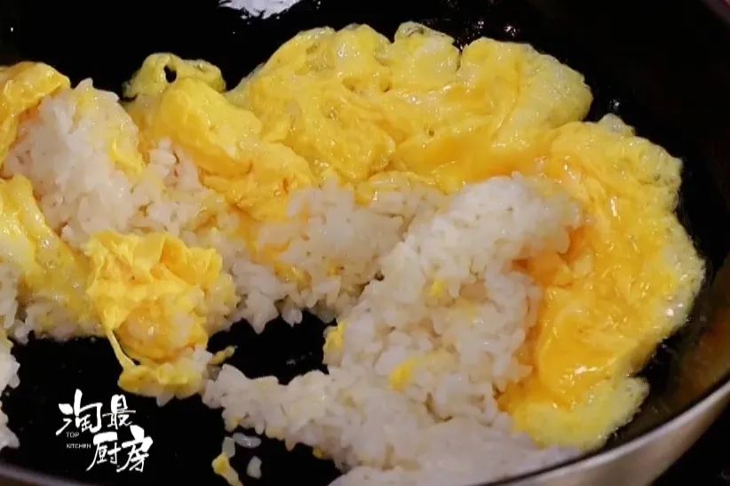 ❷ 米饭下锅与鸡蛋一起翻炒,炒到米饭不沾底。