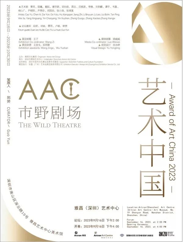 “市野剧场——AAC艺术中国2023”于2023年9月16日至10月30日在深圳市雅昌艺术中心展出,策展人郭赟,雅昌文化集团主办,深圳市雅昌艺术中心承办,深圳市宣传文化事业发展专项基金支持。参展艺术家曹雨、陈曦、戴耘、葛宇路、胡向前、蒋志、厉槟源、李燎、刘勃麟、谭平、韦嘉、杨心广、尹朝阳、尹秀珍、郑国谷、张小涛、张湘溪。