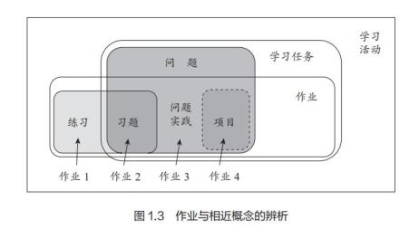 这些概念之间的关系如图1.3所示。它们之间组合而形成的不同的“集合”有助于我们展开关于“作业”的分类分析。从“作业1”到“作业4”隐藏着一个渐进的线索,尽管图中标注的词语未必确切。