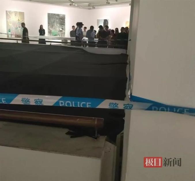 张先生还介绍,现场二楼天井上空有一大块平铺的黑布,高度与三楼护栏的上沿持平。据家属向美术馆了解,当天的那场展览是从9月开始的,一直持续到10月。为配合展览,馆内在二楼设置了一个投影厅。为了保证投影的效果,就在二楼天井上空拉起了这块黑布。