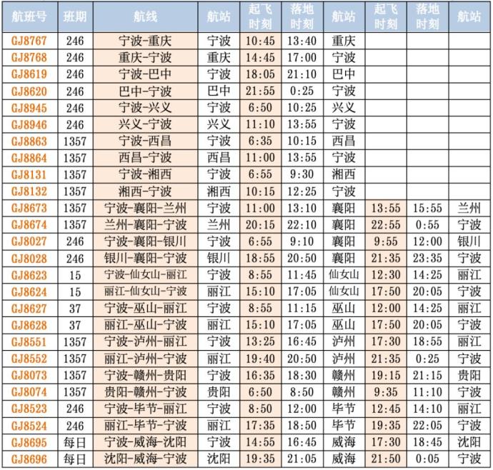 航班换季后,长龙航空在宁波机场最新时刻表。此外,作为长龙航空的副主基地,10月29日起,宁波机场还将新增宁波经泸州飞丽江、宁波经襄阳飞兰州等航线。