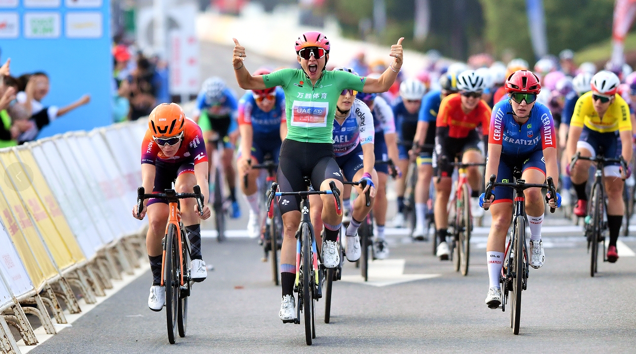 10月14日,2023年环崇明岛国际自盟女子公路世界巡回赛落下帷幕,来自阿联酋ADQ女子职业车队的康松尼·基亚拉包揽个人总成绩和冲刺总积分第一。