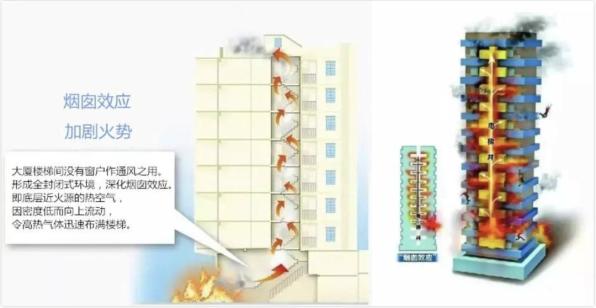 是指户内空气沿着有垂直坡度的空间向上升或下降,造成空气加强对流的现象。有实验证明,一座30层、高约100米的建筑在无阻挡的情况下烟气从一楼到顶楼只需30秒!
