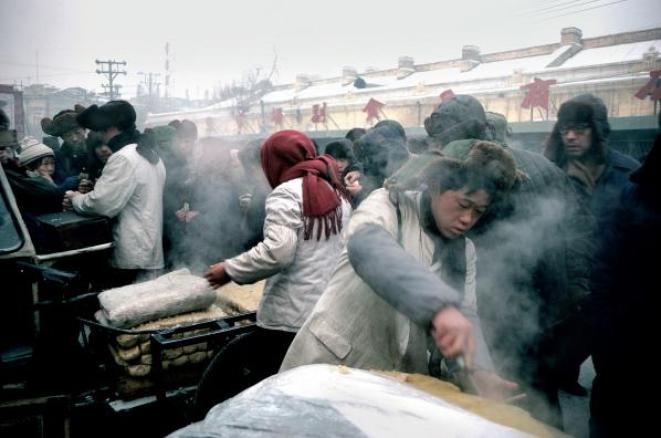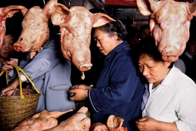 在零下35度的哈尔滨,一清早猪肉铺的人把整猪倒在中央大街上