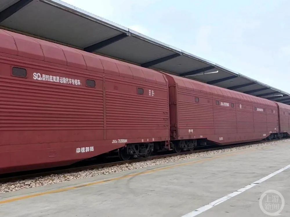 李江娜介绍,笼车车厢专为商品车运输设计,内部分为上下两层,每节车厢可装载9至10辆汽车,前后厢门打开后可实现整列首尾贯通。商品车能直接驶入车厢,相比每个集装箱只能搭载2到3辆汽车,运量大幅提升。