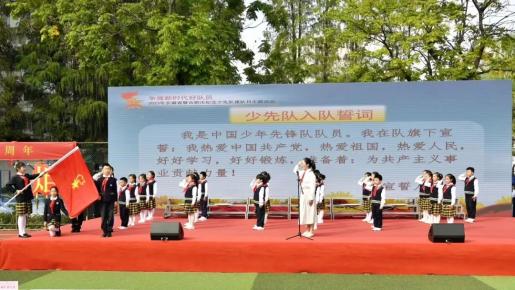 少先队入队宣誓。丰富多彩的争章活动陪伴着队员们一起成长,在争章过程中学会了自理、自护、自律、自学、自强,同时也涌现出一批优秀集体和个人。为进一步构建阶梯式成长激励体系,切实增强少先队员光荣感,现场,与会嘉宾依次为获得红领巾各级星章的集体和个人授牌、颁章。党员、团员、队员代表共同发表护章宣言,并将党旗、团旗、队旗庄重地传递给少先队员,深切寄语他们要永远听党话,跟党走,传承红色基因,让星星火炬永放光芒。“红色旗帜,代代相传”的口号响彻全场。