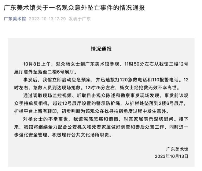 10月13日,广东美术馆就一名观众意外坠亡事件,发布情况通报。