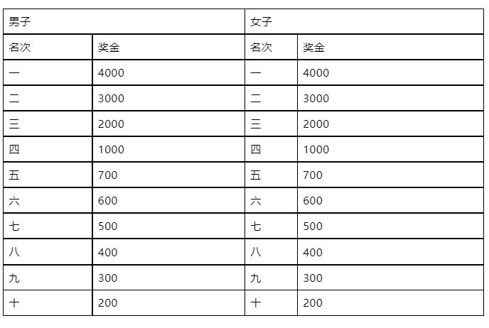 名次奖:奖励半程马拉松男、女第一至十名,其中前三名获奖选手以枪声成绩录取,第四至十名以净计时成绩录取,奖金见下表(人民币,单位:元)