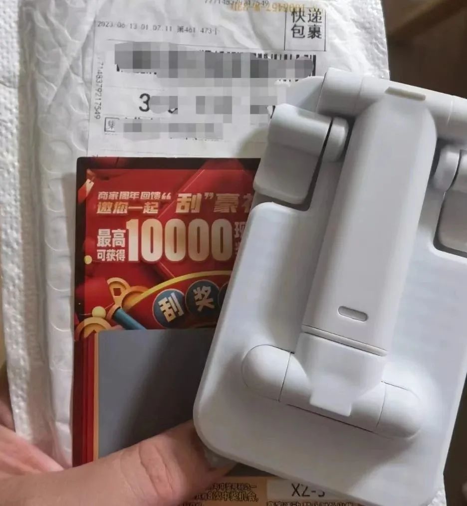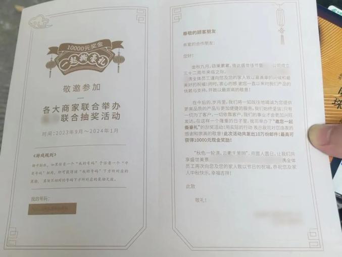 近日,不少市民收到了这样的快递,其中夹着一张商家周年回馈抽奖卡和一封某品牌公司的致谢信,称为回馈客户举办“一起撕好礼”刮奖活动。