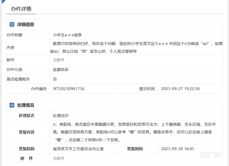9月28日,山东省语言文字工作委员会办公室回复称:根据汉语拼音方案,单韵母o可以参考“喔”的发音。
