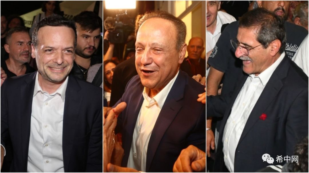 从左到右分别为雅典、塞萨洛尼基和帕特雷市当选市长由希腊第三大政党泛希社运(即变革运动)党支持杜卡斯在赢得选举后表示“雅典这座城市正在翻开新的一页。我要感谢雅典的人们,我知道我所要承担的责任。选民们们已经实现了不可能的目标。”