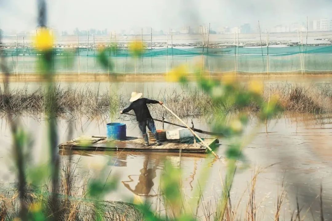 滩涂养殖户趁着退潮时期