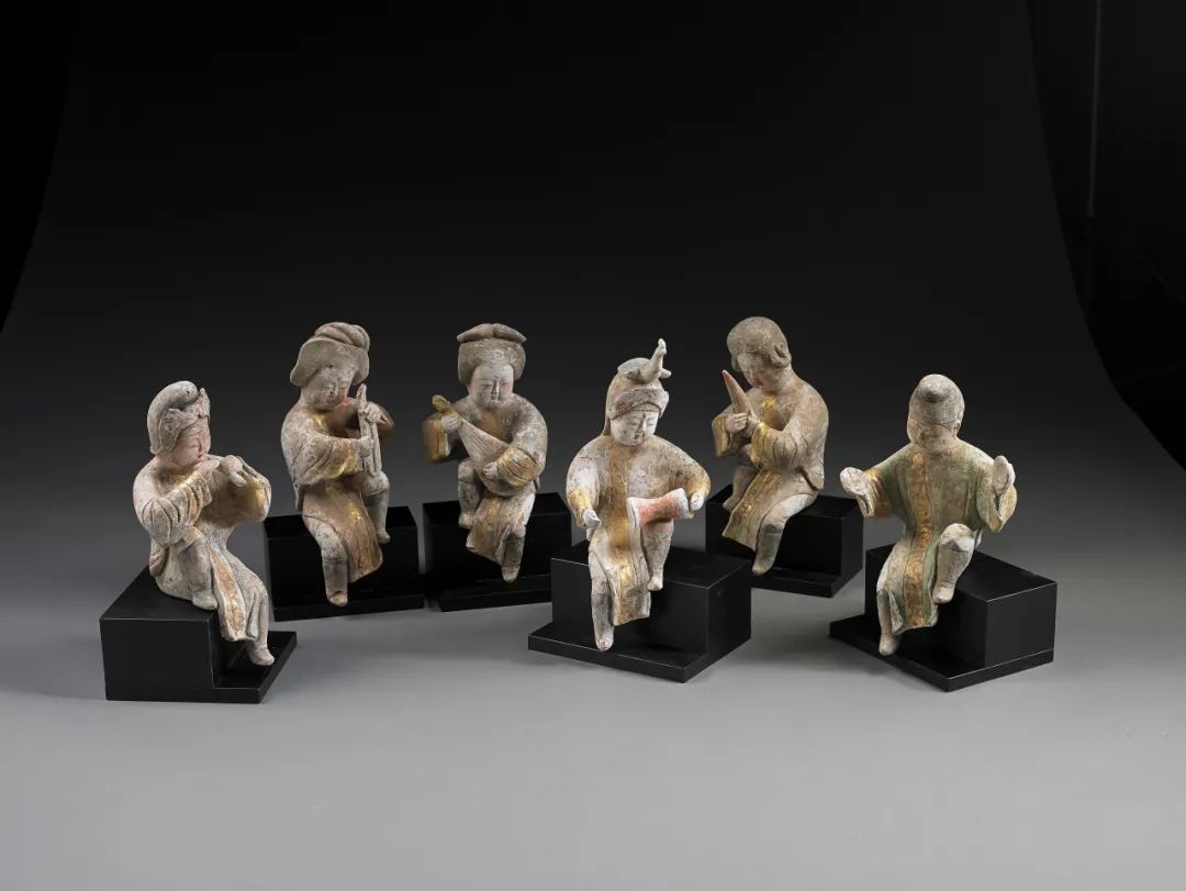 【唐代】彩绘陶金彩乐俑,震旦博物馆藏图中乐俑从左至右分持