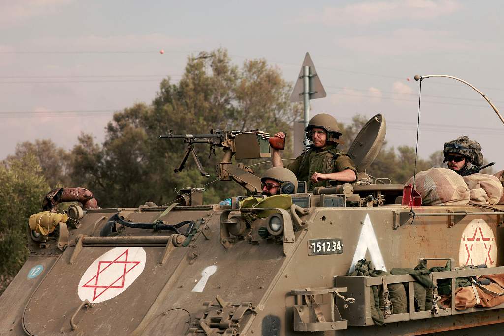 当地时间2023年10月16日,以色列士兵驾驶装甲车驶向加沙地带边境。视觉中国 图