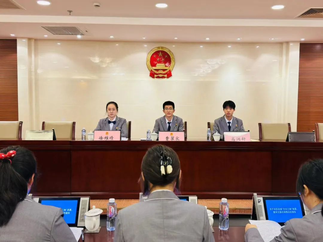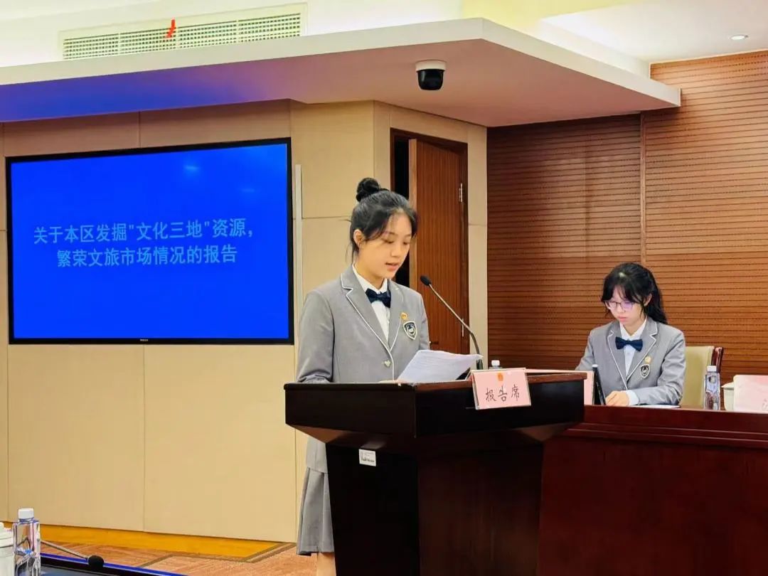 作为“区人大常委会主任”,会议由虹口高级中学高二学生曹瞿宸主持。随后,“区文化和旅游局局长”向在座常委会“委员”作报告。在听取报告后,“委员”们纷纷举手发表意见,开始现场模拟审议。