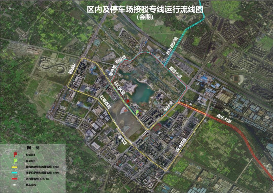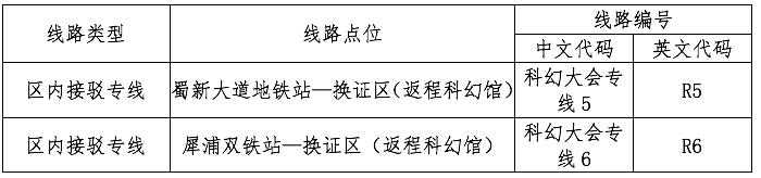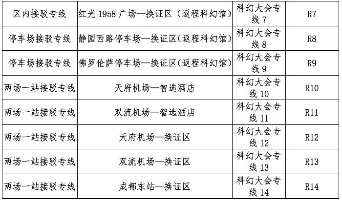 (2)在红光1958时代广场附近,换乘科幻大会区内接驳专线R7前往成都科幻馆。换乘点位:乘车点位于徐独路和广场路交叉口西北角,班车从10月16日至10月22日每日运行。